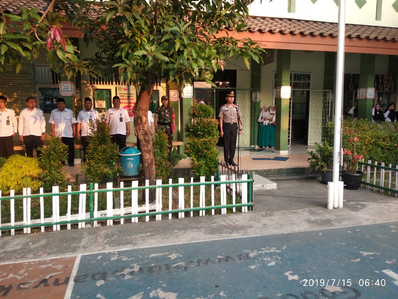 NASIONALNEWS.ID, JAKARTA – Kanit Bin Polmas Iptu Tunari menjadi pembina Upacara bendera di halaman Sekolah MTS.N 8 Komplek BTN Jalan Seruni Perumahan Kresek Indah, RW 12 Kelurahan Duri Kosambi, Kecamatan Cengkareng, Jakarta Barat, Senin (15/7/2019). pag