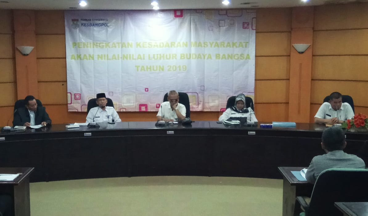 NASIONALNEWS.ID, TANGERANG – Badan Kesatuan Bangsa dan Politik (Kesbangpol) Kabupaten Tangerang menggelar dialog peningkatan kesadaran masyarakat akan nilai-nilai luhur budaya Bangsa Tahun 2019 di ruang rapat parakan, gedung PU lantai 2 Tigaraksa Tangerang, Banten. Rabu (15/5/2019).
