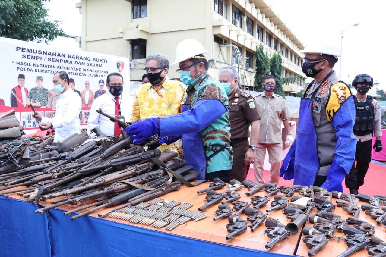 Adapun barang bukti yang dimusnahkan, yaitu Senpira 257 pucuk, Senpira pendek 79 pucuk, Senpi standar panjang 19 pucuk, Senpi standar pendek 30 pucuk, amunisi 107 butir dab Sajam 85 bilah.